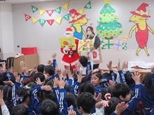 「メリークリスマス!!」の声と共に、サンタさん登場!写真は後半に行った、年中・年長組さんのクリスマス会の様子です。身を乗り出して喜びの声を上げる子や、声にならない感動でサンタさんを見つめる子、嬉しくて嬉しくてたまらない様子でした。